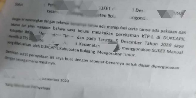 Kepala Dinas Kependudukan dan Catatan Sipil (Dukcapil), Rusmin Mokoagow, mengaku tidak pernah mengeluarkan surat pernyataan seperti yang dibawa oknum tersebut. “Tidak ada. Kami tidak pernah mengeluarkan surat begitu. Kemudian juga tidak ada honorer kami yang bernama Meilan,” katanya, saat dikonfirmasi, Kamis (14/1).