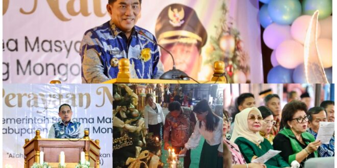 JurnalMongondow.Net-Perayaan Ibadah Natal Pemerintah Kabupaten Bolaang Mongondow Raya bersama masyarakat berlangsung khidmat dan penuh sukacita bertempat di Desa Mopuya, Kecamatan Dumoga Utara, Rabu (17/12/2025).Gubernur Sulawesi Utara Yulius Selvanus hadir langsung dalam perayaan tersebut, didampingi Ketua TP-PKK Sulut Ny. Anik Yulius Selvanus, sebagai wujud kedekatan pemerintah dengan masyarakat.Kehadiran Gubernur disambut hangat oleh masyarakat, tokoh agama, serta jajaran Pemerintah Kabupaten Bolaang Mongondow Raya, mencerminkan hubungan yang harmonis antara pemerintah dan wargaMenariknya saat Gubenur memebrikan sambutan bertepatan dengan bekumandangya Azan Magrib, seketika Gubenur YSK berhenti sejenak untuk meyelesaikan Azan magrib berkumandang usai Azan berkumadang Guberbur YSK melanjutkan sambutanya menekankan bahwa Natal membawa pesan kasih dan terang yang harus diwujudkan secara nyata dalam kehidupan bermasyarakat, bukan sekadar seremoni keagamaan.“Kami mengapresiasi terhadap kuatnya toleransi antarumat beragama di Bolaang Mongondow yang menjadi Fondasi penting dalam menjaga persatuan dan stabilitas daerah.” Ucap Gubenur YSK Menurut Gubernur, nilai kasih Natal mampu memperkuat relasi sosial, mulai dari lingkup keluarga, komunitas, hingga pemerintahan di berbagai tingkatan.“ Kami meyakini bahwa semangat saling menghormati dan menghargai yang hidup di tengah masyarakat Mopuya menjadi salah satu Faktor Pendorong Kemajuan wilayah ini . “ ImbuhnyaPada kesempatan itu, Gubernur juga menyampaikan perkembangan terkait bantuan ambulans yang sebelumnya diusulkan untuk masyarakat setempat, dimana tanggal 27 Deaember sudah akan berada di Bolmong. Bantuan ini merupakan janji Gubernur pada masyarakat Bolmong khususnya Dumoga. “ Dalam waktu dekat ini bantuan mobil ambulance itu akan tibah di bolmong, saat ini, masih dalam pengurusan perlengkapanya Gubernur Yulius Selvanus turut menegaskan pentingnya sinergi antara pemerintah kabupaten, Provinsi, dan pemerintah pusat dalam menjalankan program pembangunan.“ Koordinasi lintas pemerintahan merupakan kunci agar setiap kebijakan dan program dapat berjalan efektif dan saling melengkapi. ” Ucapnya Gubrnurpun berharap momentum Natal ini semakin memperkuat komunikasi, kerja sama, dan persatuan dalam upaya membangun daerah serta meningkatkan kesejahteraan masyarakat.“ Jadikan momentum Natal ini, sebagia momntum sinergitas antara pemerinta dan masyarakat demi terwujudnya pembangunan di sulawesi utara yang berkelanjutan.” HarapnyaIbadah Menjelang Natal tersebut ditutup dengan suasana damai dan kebersamaan, serta penyerahan bantuan dari Pemerintah Provinsi Sulawesi Utara kepada masyarakat dan Pemerintah Kabupaten Bolaang Mongondow.