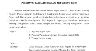 JM.com,KOTAMOBAGU-Aparatur Sipil Negara (ASN) dan Tenaga Harian Lepas (THL) di lingkungan Pemerintah Kabupaten Bolaang Mongondow Timur (Boltim), diwajibkan menggunakan Pakaian Adat Bolaang Mongondow Baniang dan Salu mulai Kamis 22 September …